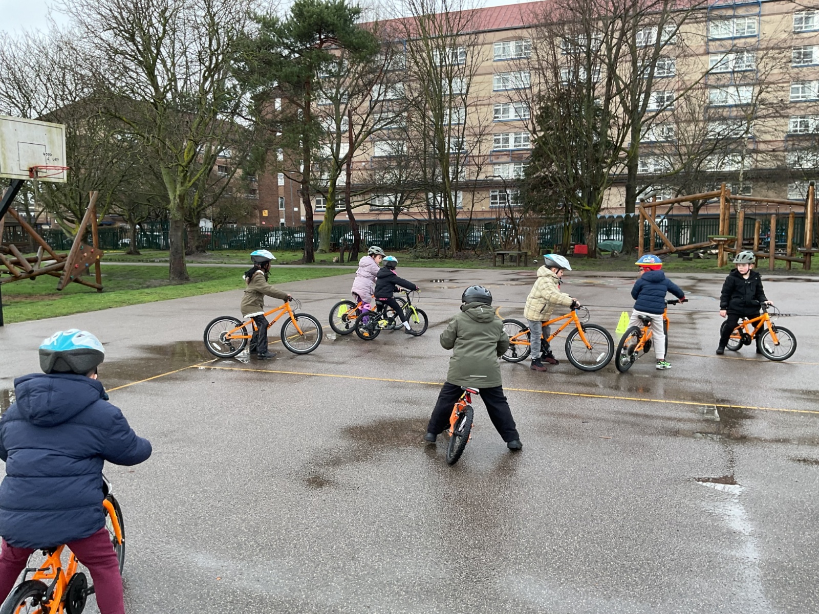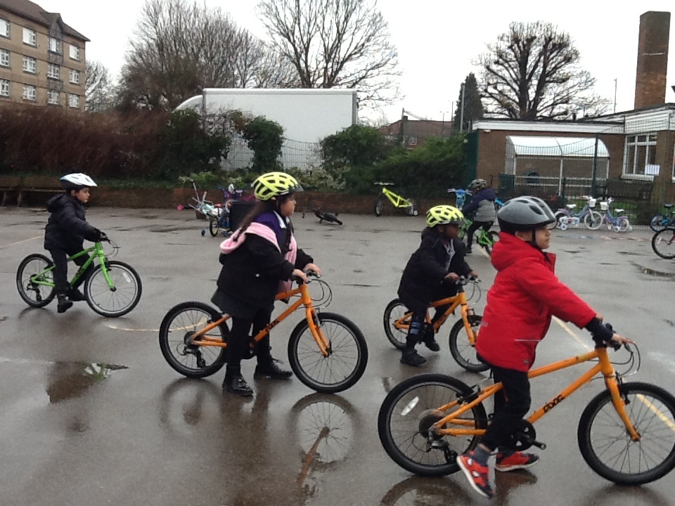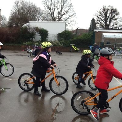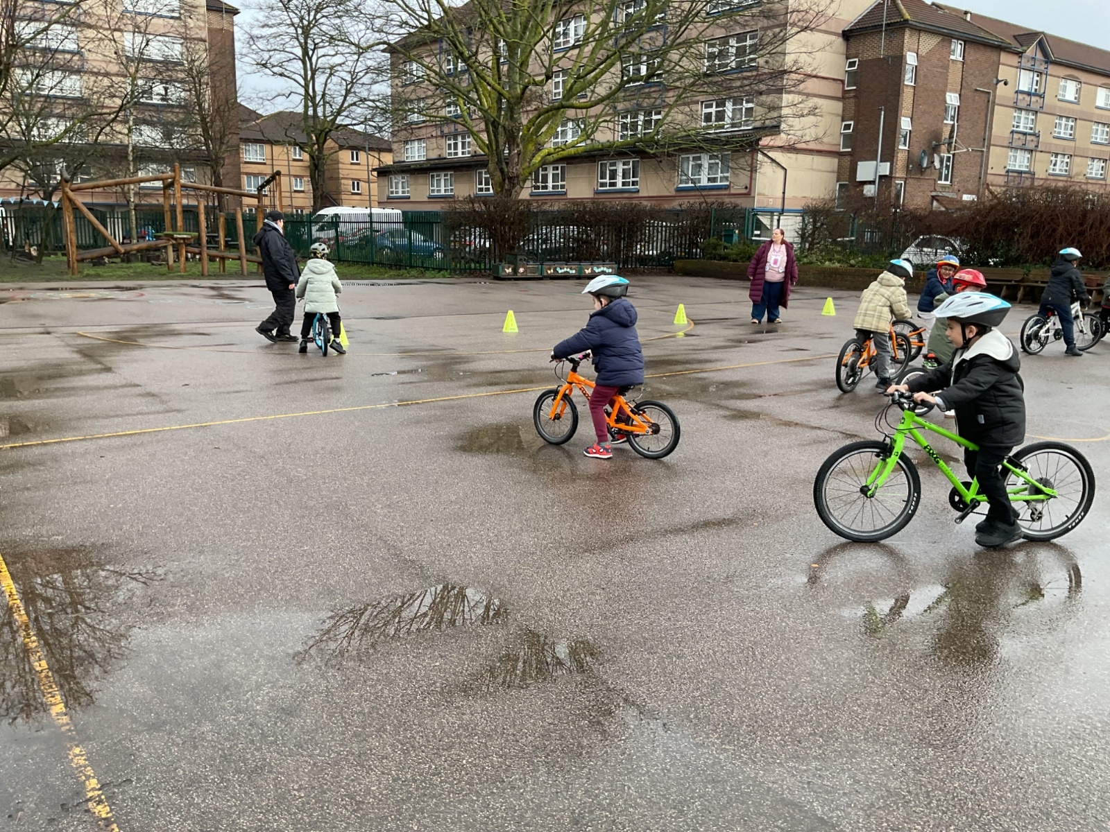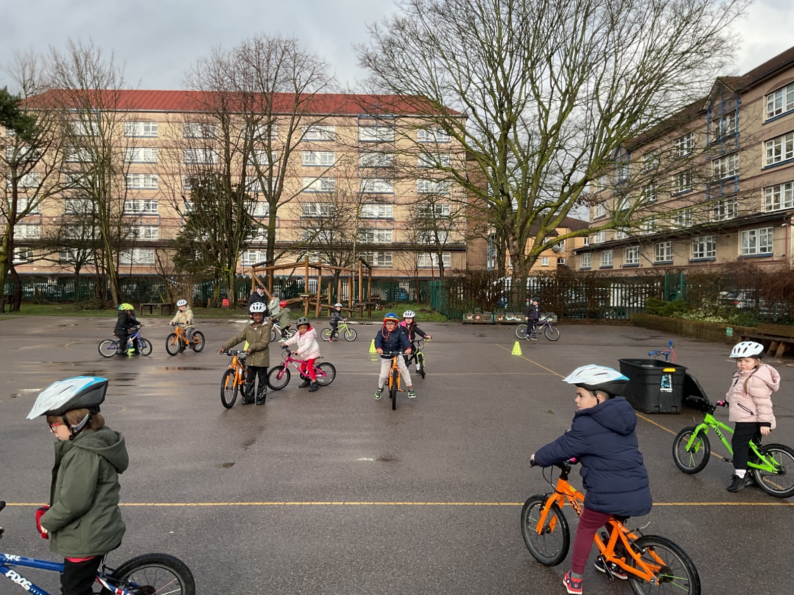 Children from Year 1 to Year 3 practised riding their bikes in the playground.